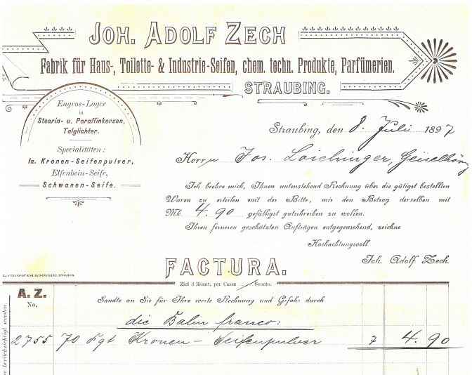 - 1874 geht die Seifensiederei Hoppenthaler durch die Heirat von Franziska Hoppenthaler mit Adolf Zech an diesen über.