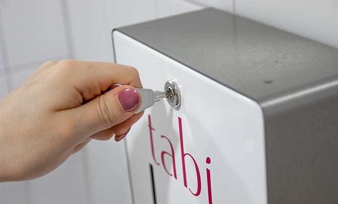 Der tabi-Spender bietet eine hygienische Lösung für die Entnahme von Damenbinden und Tampons in öffentlichen Sanitäranlagen. Dieser Spender zeichnet sich durch seine unkomplizierte und schnelle Nachfüllbarkeit aus. Eine Einzelschüttung ermöglicht eine ressourcenschonende Nutzung je nach Bedarf. Die strapazierfähige Edelstahloberfläche mit Anti-Fingerprint-Beschichtung gewährleistet Langlebigkeit und Hygiene – eine ideale Wahl für stark frequentierte Sanitäranlagen.